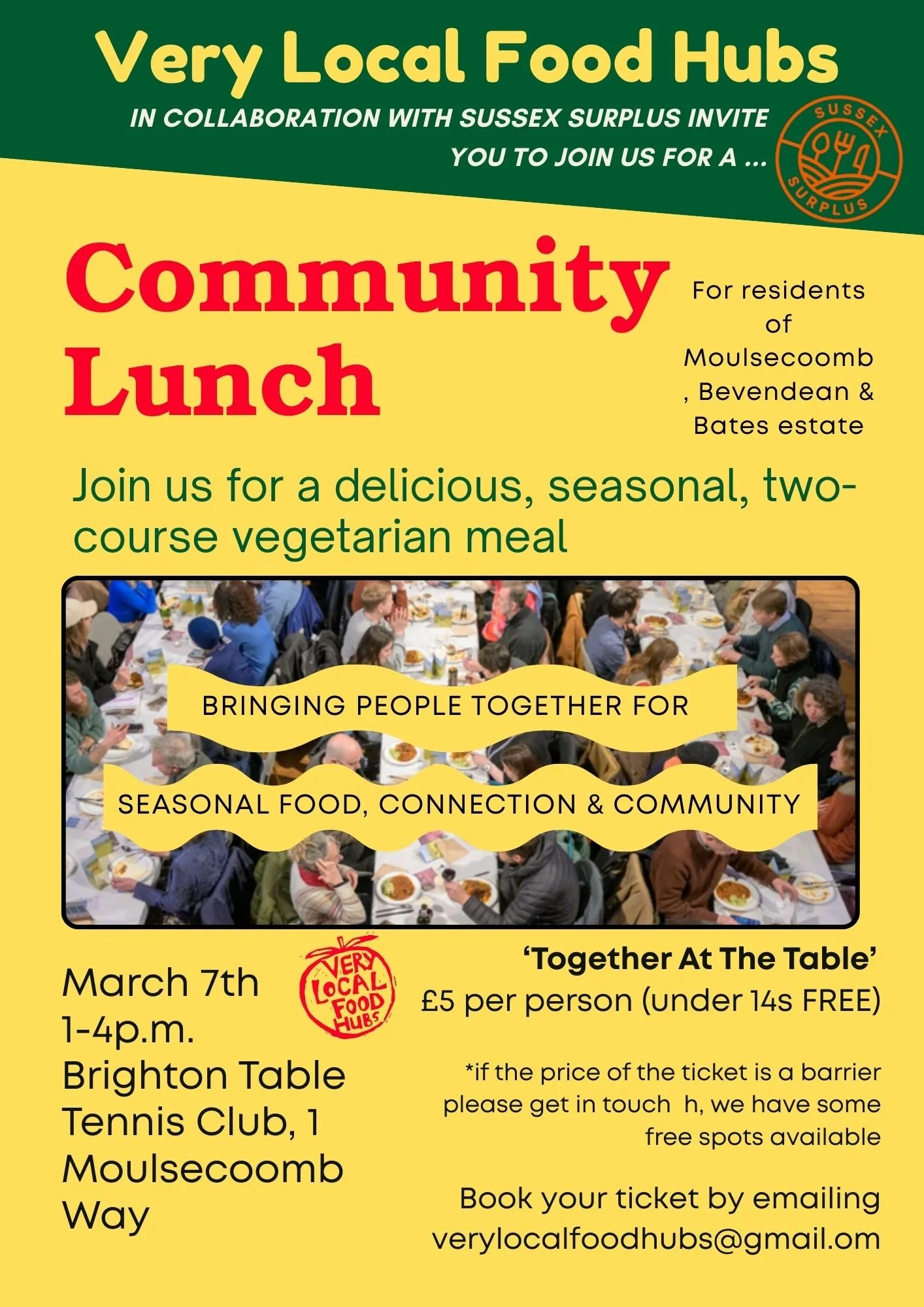 We’re excited to announce that we will be working with Sussex Surplus to put on a ‘Together at the Table’ event for members, neighbours and friends of Very Local Food Hubs. Join us for a two-course seasonal & vegetarian meal for just £5 per person (under 14s free). Connect with new neighbours and friends over the table as we all eat together, celebrating local & seasonal food and community.