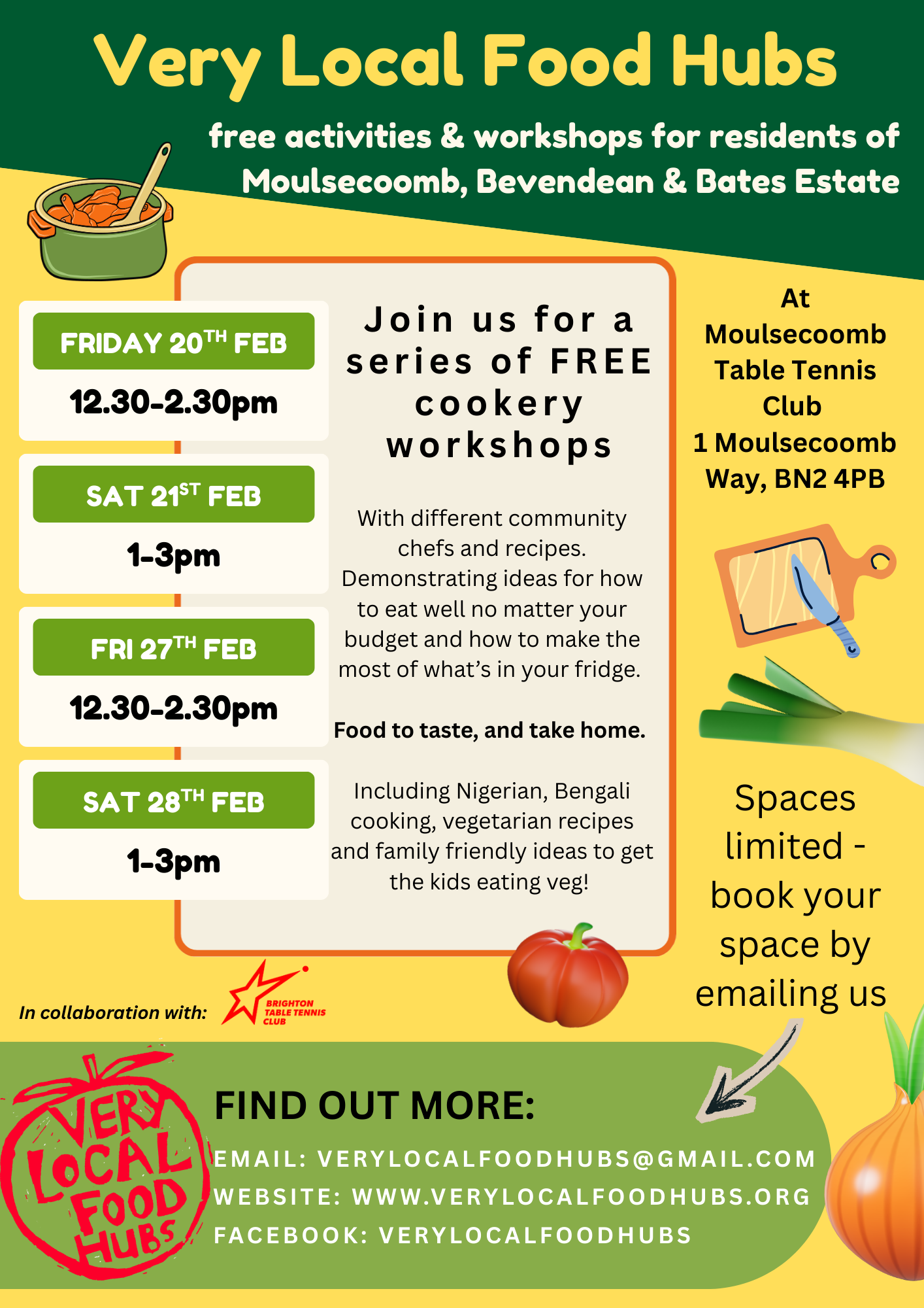 Interested in learning Nigerian or Bengali cooking? Or veggie recipes that are a hit with kids? We are hosting a series of FREE cookery workshops at Brighton Table Tennis Club in Moulsecoomb.